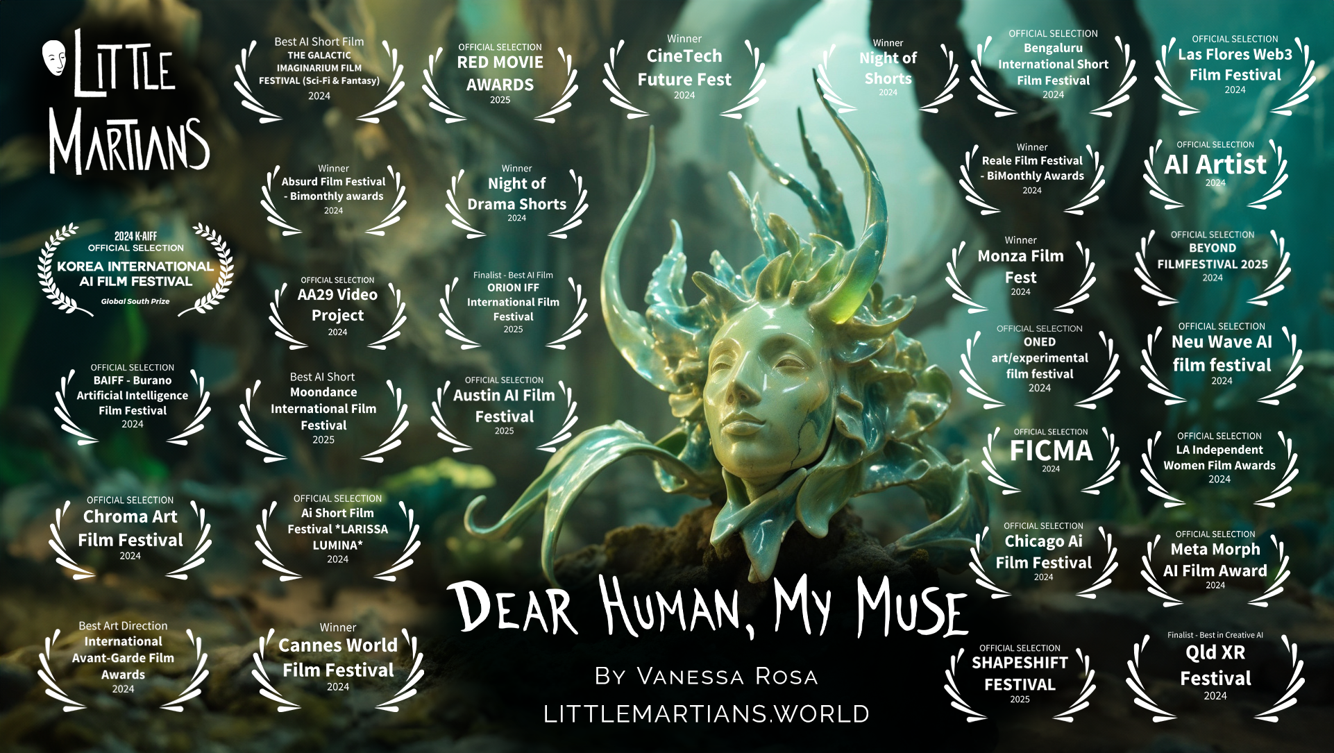 Little Martians animations have participated in over 45 film festivals around the world winning the Global South Special Prize at the Korea International AI Film Festival, Best Super Short Female Director at Cannes World Film Festival and Best Art Direction at the International Avant-Garde Film Awards, among many other prizes and features.